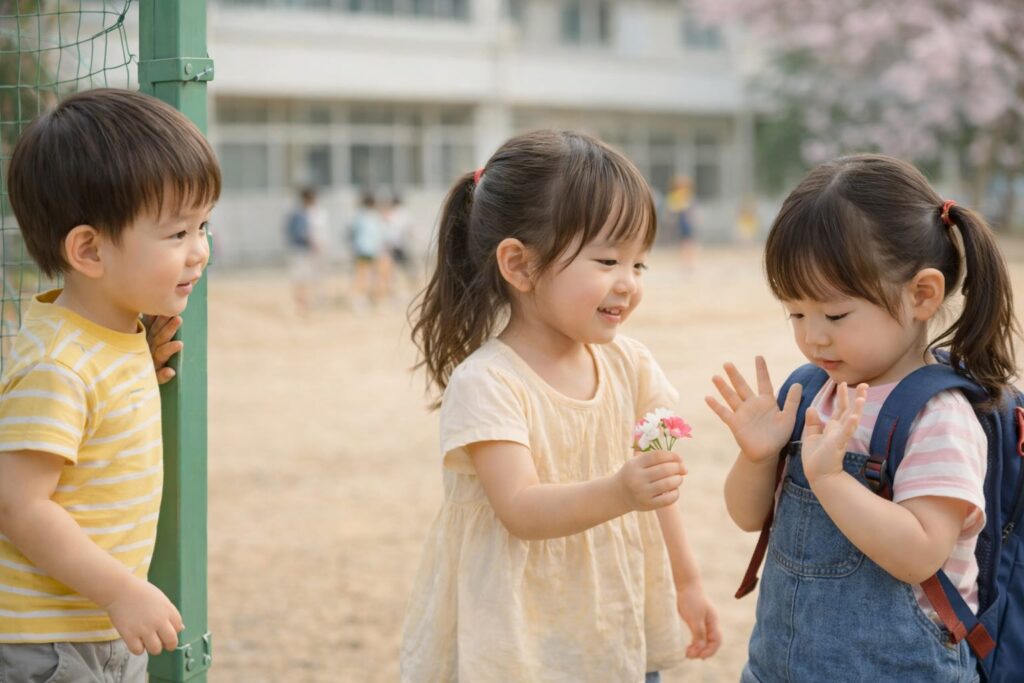 前述の通り、自分と外の区別ができるようになると、「所有の境界線」も同時に非常に強くなります。この時期の子どもにとって、お気に入りのおもちゃは「自分の身体の一部(延長)」のような感覚といわれます。友達から「貸して」と言われて拒否するのは、意地悪をしているのではなく、自分の境界線(ナワバリ)を侵略されるような恐怖や不安を感じているからだとされます。境界線の意識が強いうちは、同じ場所で同じおもちゃを使っていても、それぞれが自分の世界で遊んでいる状態です。これを並行遊びと呼びます。その後、境界線を少しずつ開放し、「一緒にこれ作ろう」と共通の目的で関わり始めます。3歳頃からこのような連合遊びが始まり、自分と相手の「やりたいこと」を調整する力が育ってくるといわれます。